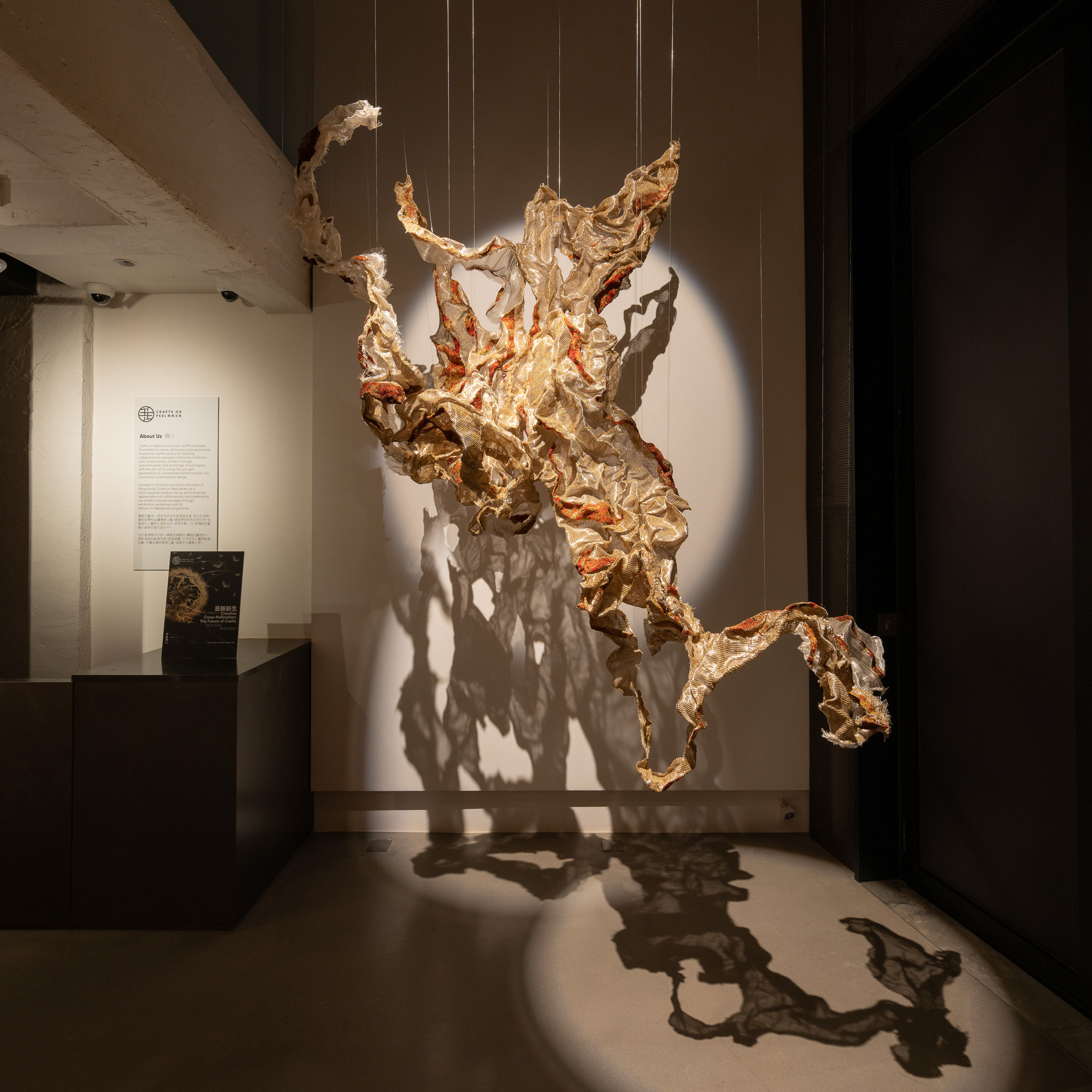 Gamzar began his apprentice journey by learning the basic techniques of crafting galvanized iron from Master Michael Yu. Gamzar discovered that galvanized iron was not as hard as imagined but slightly elastic, soft on the outside and rigid inside, making it challenging to handle. This binary quality of the material reminded him of the Chinese philosophy of Yin-yang — harmony is created through opposites: motion and stillness, odd and even, rigid and soft. When designing the work, Gamzar incorporated two polarities with paper fans to convey his concept, using parametric design to analyze the shape and simulate the overall structure.